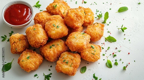 Golden crispy fried nuggets served with a side of tangy ketchup on a white background
