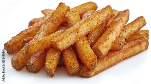 Golden crispy fries piled high on a white surface, ready to be served with a dipping sauce