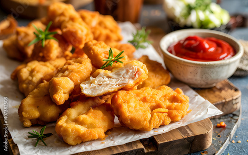 Golden Crispy Nuggets and Dip: A mouthwatering close-up showcases an appetizing pile of golden crispy nuggets, perfectly complementing a small bowl of vibrant ketchup