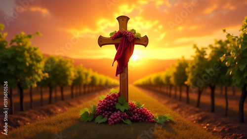 Golden cross with grapevine crown in vineyard. Amber sunset creates 12K Eucharistic metaphor.