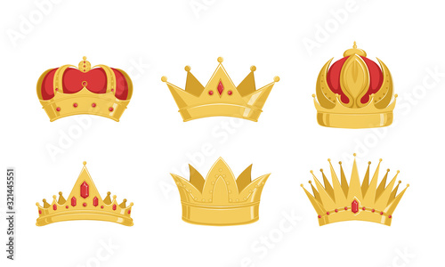 Golden Crowns Collection, Royal Symbols of Power of Kings or Imperiors Vector Illustration