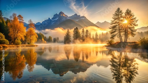 Golden Dawn Illuminates a Mist-Shrouded Mountain Lake with Silhouettes of Trees Reflecting in the Still Waters