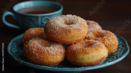 donut, donut, sugar, dessert, sweet, pastry, baked, treat, confectionery, food, still life, table, cup, beverage, tea, teal, blue, breakfast, snack, delicious, tasty, cookery, epicure, plate, stack, brown, warm, aromatic, culinary, refreshment, homemade, traditional, baked goods, refreshment, bakery, kitchen, dough, indulgence
