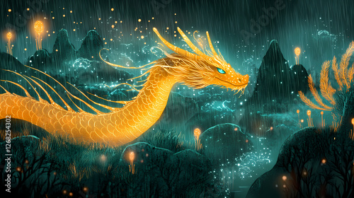 Golden dragon with emerald sparkles in rainy landscape. Golden Storm Serpents. Illustration