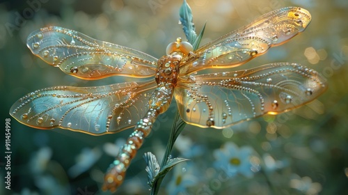 dragonfly, insect, wing, dew, drop, nature, macro, wildlife, closeup, photo, beautiful, art, gold, shiny, sparkle, jewellery, transparent, green, background, garden, flower, field, summer, sunlight, light, blurry, abstract, organic, pattern, texture, detailed, fine, bright, detail, artistic, high-coloured