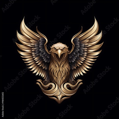 eagle, golden eagle, gold, emblem, wing, bird, majestic, powerful, animal, design, graphic, illustration, logotype, symbol, heraldic, vintage, antique, art, artwork, tattoo, vector, metallic, luxury, elegant, ornate, crest, hawk, bird of prey, wildlife, nature, abstract, background, black background, school, retail, digital, dynamic, teamwork, people, royalty free