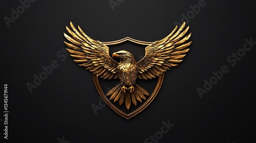 eagle, shield, gold, logotype, three-dimensional, render, corporate, identity, black, background, wing, bird, power, symbol, security, protection, freedom, majesty, prestige, success, luxury, wealth, strength, authority, emblem, crest, design, graphic, image, abstract, metal, texture, vector, illustration, art, concept, badge, icon, brand, premium, elegant