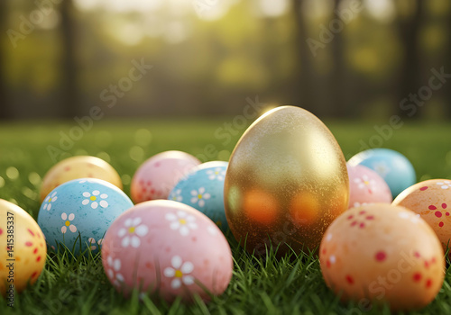 Golden Easter egg shiny surface centered in a cluster of decorated eggs various pastel colors