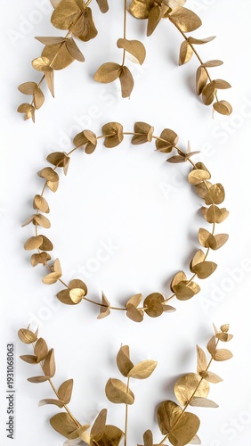 eucalyptus, gold, leaf, gold, branch, chaplet, white, background, nature, metallic, shiny, bright, simple, minimal, elegant, botanical, foliage, plant, decorative, circle, frame, pattern, texture, arrangement, detail, overhead, view, vertical, copy, space, modern, aesthetic, organic, design, style, still, life, art, element, template, celebration, holiday, luxurious, glamour, refined, glossy, precious, gilded