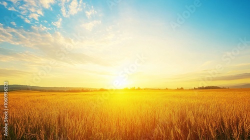 field, sunset, gold, wheat, sky, cloud, blue, sun, warm, nature, landscape, rural, farm, agriculture, summer, horizon, grass, green, light, yellow, orange, beautiful, serene, peaceful, tranquil, bright, ray, glare, shining, huge, wide, open, scenery, vibrant, natural, beauty, photo, image, photo