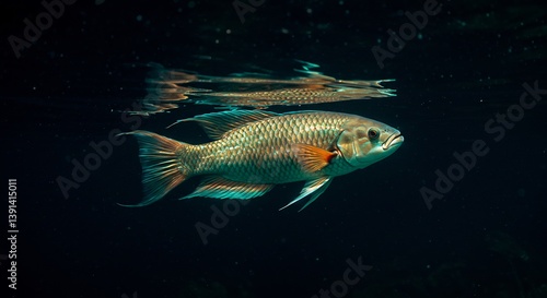 Golden fish swims in dark water low light underwater scene. AI Generated