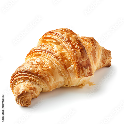 Golden, flaky croissant with a glossy finish, isolated on a white background