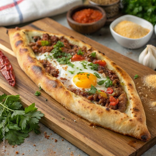Golden Freshly Baked Turkish Pide with a Crispy Crust and Egg