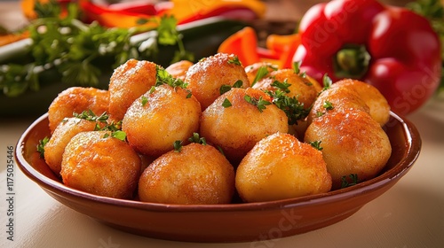 Golden Fried Potato Balls with Fresh Herbs and Colorful Vegetables