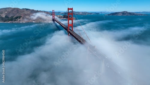 Golden Gate Bridge Fog In San Francisco California United States. Elevated Road Bridge Symbol Of The City Viewed From Above. Business Sky Downtown Cityscape. Business Backgrounds Panorama.