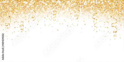 party, christmas, new year, festive, holiday, empty space, glistering, gold, confetti, sparkle, falling, streamer, ribbon, ribbon, serpentine, dust, shiny, shimmer, glamour, texture, foil, glossy, bright, overlay, decor, decoration, background, light, elegant, luxury, isolated, header, vector, invitation, celebration, birthday, wedding, anniversary, congratulation, carnival, chic, magic