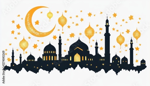mosque, city landscape, night, star, moon, gold, glistering, islamic, lantern, festival, celebration, ramadan, eid, silhouette, architecture, building, sky, dark, bright, light, gold, black, design, graphic, illustration, holiday, religion, culture, tradition, spirituality, faith, peace, hope, joy, art, abstract, background, image, digital, festive, ornament, pattern, texture, crescent, starry, sparkle