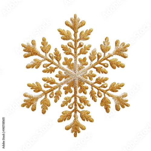 Golden glitter snowflake on white background. Christmas and winter holiday decoration.