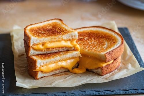 Golden Grilled Cheese Sandwich with Stretching Cheese on Dark Slate