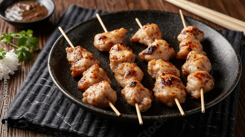 Golden grilled chicken skewers rest on a sleek black plate, bursting with smoky flavor, savory texture, and mouthwatering roasted perfection. AI generated.