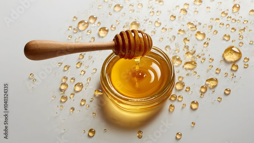 Golden Honey Dripping from a Wooden Dipper Over a Glass Jar