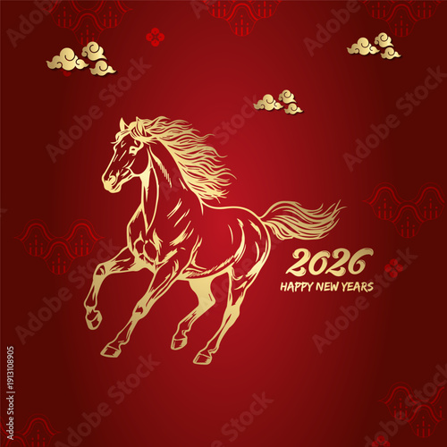 Golden Horse Illustration with 2026 Happy New Year Text on Red Festive Background