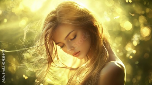 blond, woman, girl, hair, long hair, golden hour, sunlight, sun, nature, outdoors, beautiful, pretty, model, portrait, photo, dreamy, aethereal, magical, summer, spring, light, bokeh, soft, gentle, peaceful, serene, calm, relaxed, eyes closed, wind, romantic, feminine, delicate, elegant, beauty, fashion, style