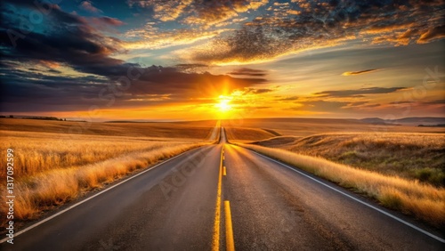 Golden Hour Drive A Scenic Asphalt Road Through Rolling Fields at Sunset