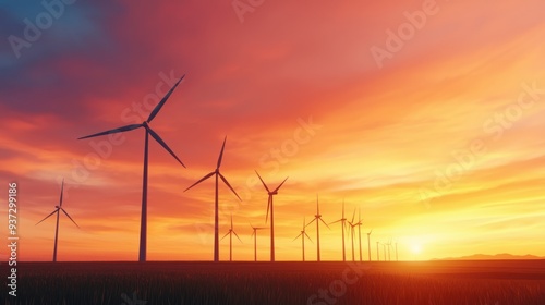 Golden Hour Glow: Scenic Wind Turbine Field at Sunset Promoting Renewable Energy and Environmental Conservation