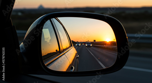 Golden Hour Highway: Sunset Reflected in Car Mirror