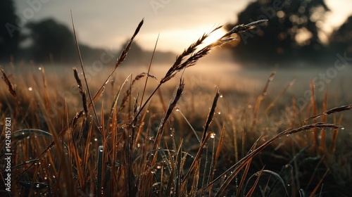 Golden hour mist falling on standard grass serene landscape realistic photograph nature ground level tranquility
