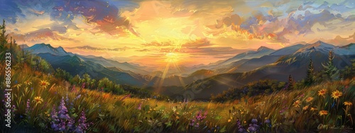 sunset, mountain, gold, light, hill, sky, cloud, landscape, painting, art, nature, scenic, view, beautiful, horizon, ray, field, grass, flower, wildflower, summer, evening, dusk, dawn, sunrise, bright, colourful, vibrant, orange, red, yellow, blue, green, purple, pink, illustration, digital, artwork, artistic
