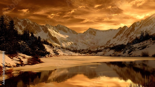 mountain, snow, lake, sunset, sunrise, gold, sky, cloud, winter, landscape, nature, scenic, beautiful, cold, ice, glacé, peak, summit, alpine, wilderness, tranquil, serene, majestic, dramatic, vibrant, orange, yellow, red, light, shadow, outdoors, travel, adventure, explore, view, vista, calm, peaceful, idylli, remote, untouched, pristine, horizon, atmosphere, weather, season, environment, geology