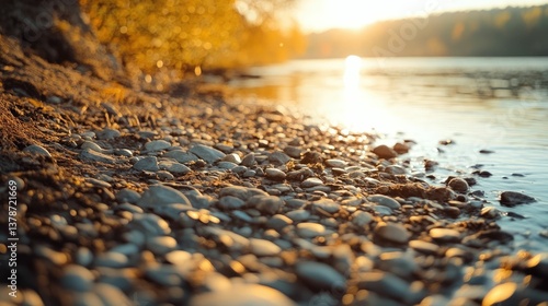 pebble, river bank, golden hour, water, landscape, nature, photo, scene, river, shore, coast, rock, stone, lake, sunlight, outdoors, scenery, daylight, calm, serene, peaceful, tranquil, environment, natural, beauty, sun, sunset, sunrise, evening, morning, light, gold, yellow, orange, warm, glow, idylli, relaxing, travel, tour tourism, vacation, holiday, get-away, destination, view, closeup