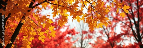 Golden hues of autumn tree leaves float gently through the air amidst a backdrop of vibrant red foliage, nature, foliage