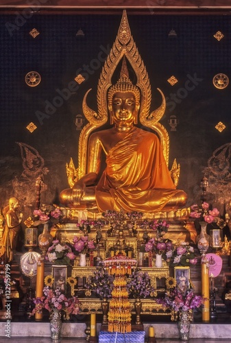 Golden image of Buddha in Thailand Monastery, Bodh Gaya, Bihar, India, Asia
