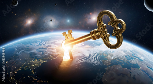 key, earth, space, universe, planet, gold, opening, opportunity, unlocking, future, potential, discovery, adventure, exploration, success, freedom, innovation, technology, access, journey, hope, dream, mystery, wonder, gold, light, ornamental, detail, design, digital, image, illustration, graphic, isolated, background, creative, concept, symbolic, vector, poster
