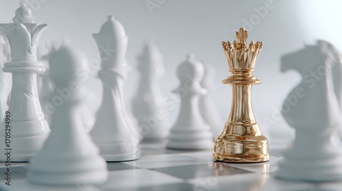 Golden king chess piece standing among white chess pieces on a chessboard, symbolizing strategy and leadership.