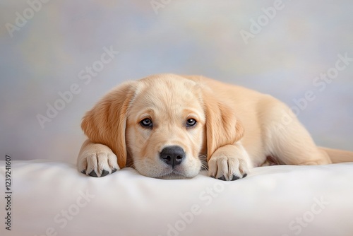 Golden Labrador Puppy Resting Softly - Adorable golden labrador retriever puppy lying down, peaceful expression, soft background, cute pet, canine.