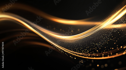 Golden light wave with sparkling particles on dark background, elegant abstract motion