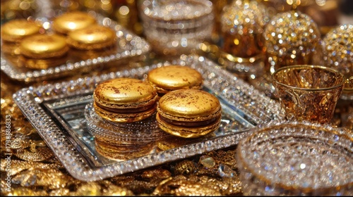 gold, luxurious, festive, glittering, ornament, tray, decorative, sparkling, silver, luxury, celebration, party, elegant, gold, shiny, glamourous, festivity, sparkle, decor, event, sweet, dessert, baked, pastry, confectionery, rich, ornate, special occasion