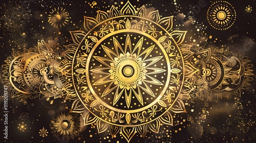 mandala, gold, cosmic, background, design, art, pattern, texture, ornate, luxury, elegant, spiritual, mystical, sacred, geometry, abstract, decorative, illustration, graphic, vector, vintage, retro, ethnic, culture, tradition, symbol, sun, star, sparkle, glistering, shine, light, dark, black, brown, yellow, orange, intricate, detailed, beautiful, aesthetic, wallpaper, template, invitation, card, festive, celebration, holiday