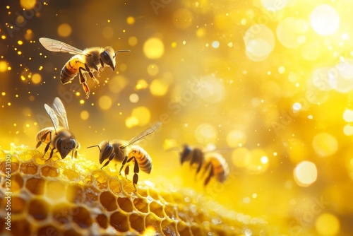 Golden Nectar Honeycomb Glimmering in Sunlight with Busy Bees, Capturing Nature s Sweetness