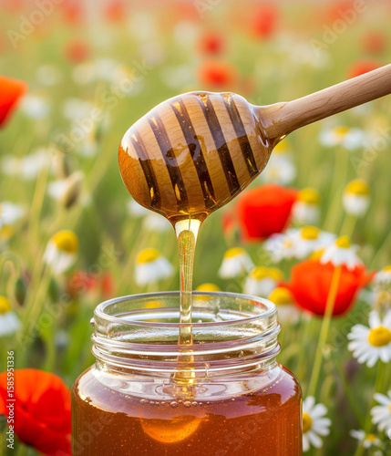 Golden, organic honey drips from a wooden dipper into a glass jar, a sweet and natural ingredient isolated on white