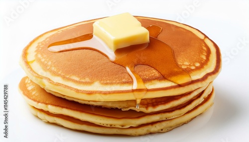 Golden pancakes stacked high, topped with butter and syrup. A delicious breakfast!