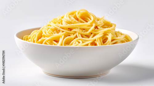Golden Pasta in a Bowl: a bowl of meticulously cooked spaghetti pasta, embodying the simplicity and delight of classic culinary expertise. A culinary masterpiece.