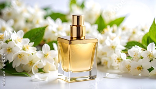 perfume, bottle, gold, jasmine, flower, floral, luxury, scent, fragrance, elegant, cosmetic, beauty, glasses, cardboard box, fresh, spring, summer, white, gold, product