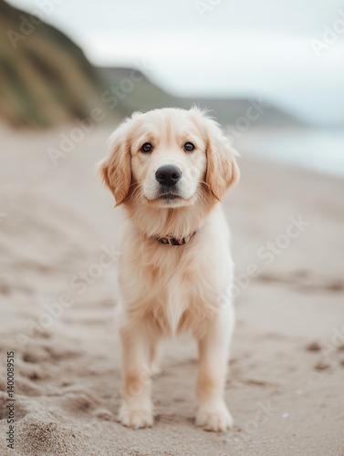 Golden puppy at the beach. Adorable young dog looking directly at the camera with blurred background.