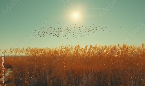 Golden reeds swaying under a bright sun, a flock of birds in flight above a serene wetland, capturing the tranquility of natures beauty at dusk.