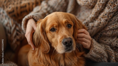 Golden retriever dog being petted by a person wearing a sweater. Pet care and companionship concept.